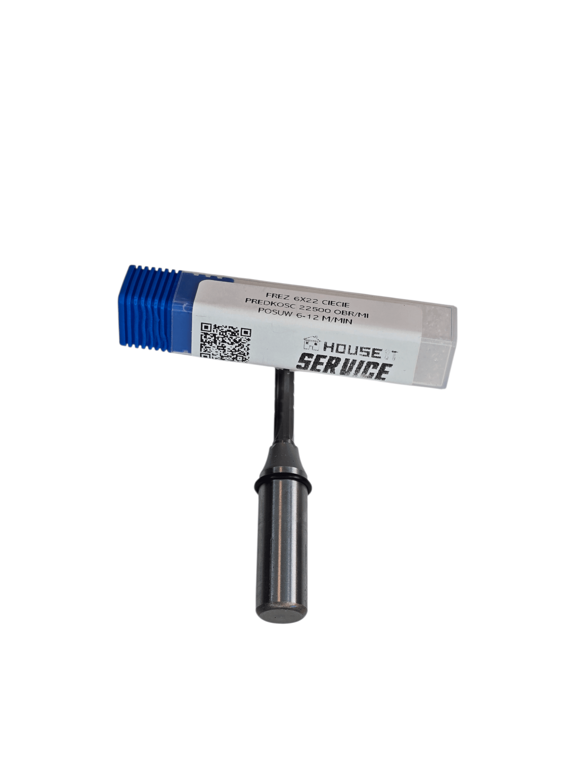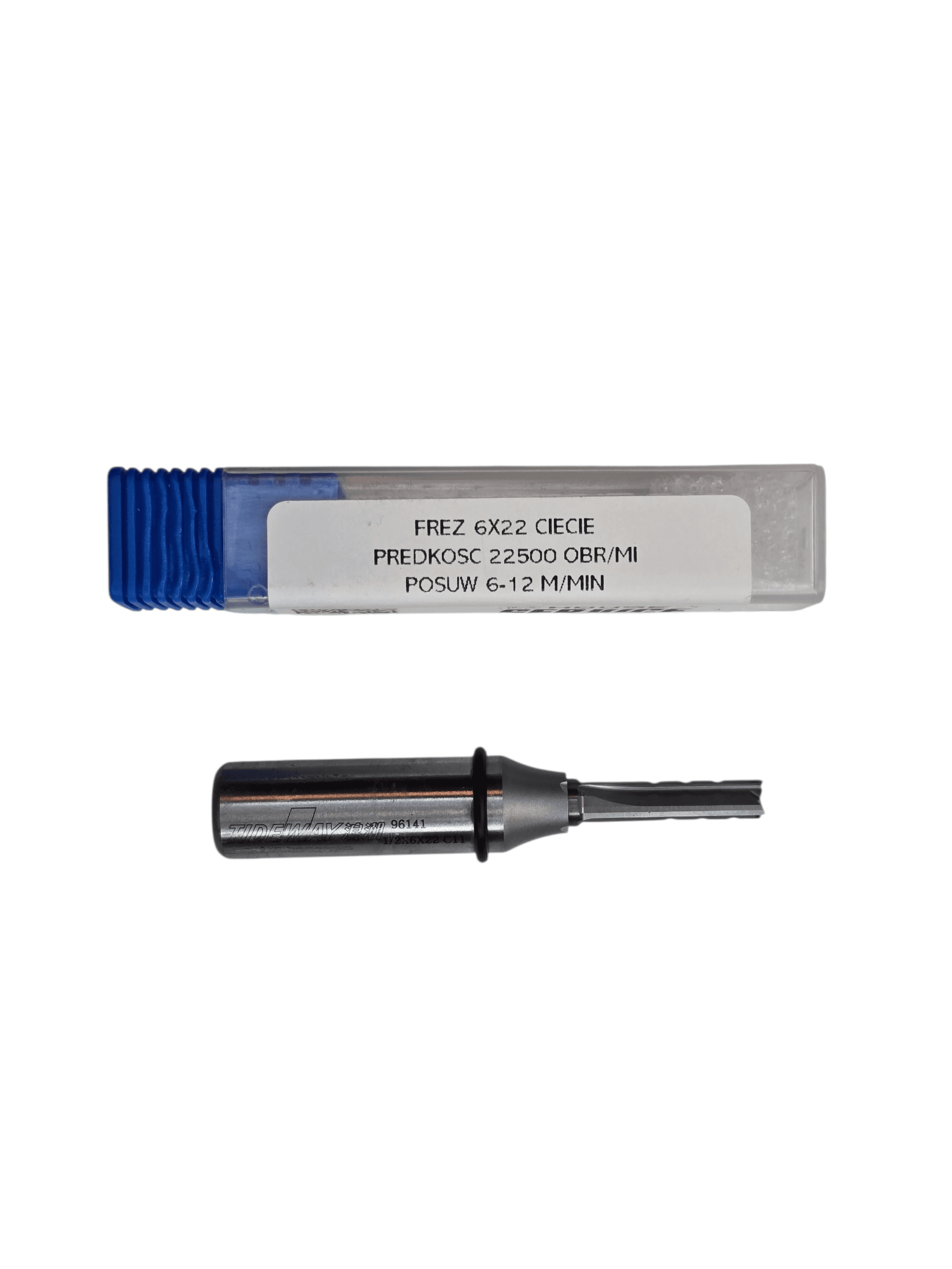 Frez CNC 6×22 mm z 4 ostrzami i łamaczem wiórów — zoptymalizowany pod nestingi. Zapewnia czyste cięcie drewna, MDF i laminatów przy pracy z obrotami do 22 500 rpm i posuwie 6–12 m/min.